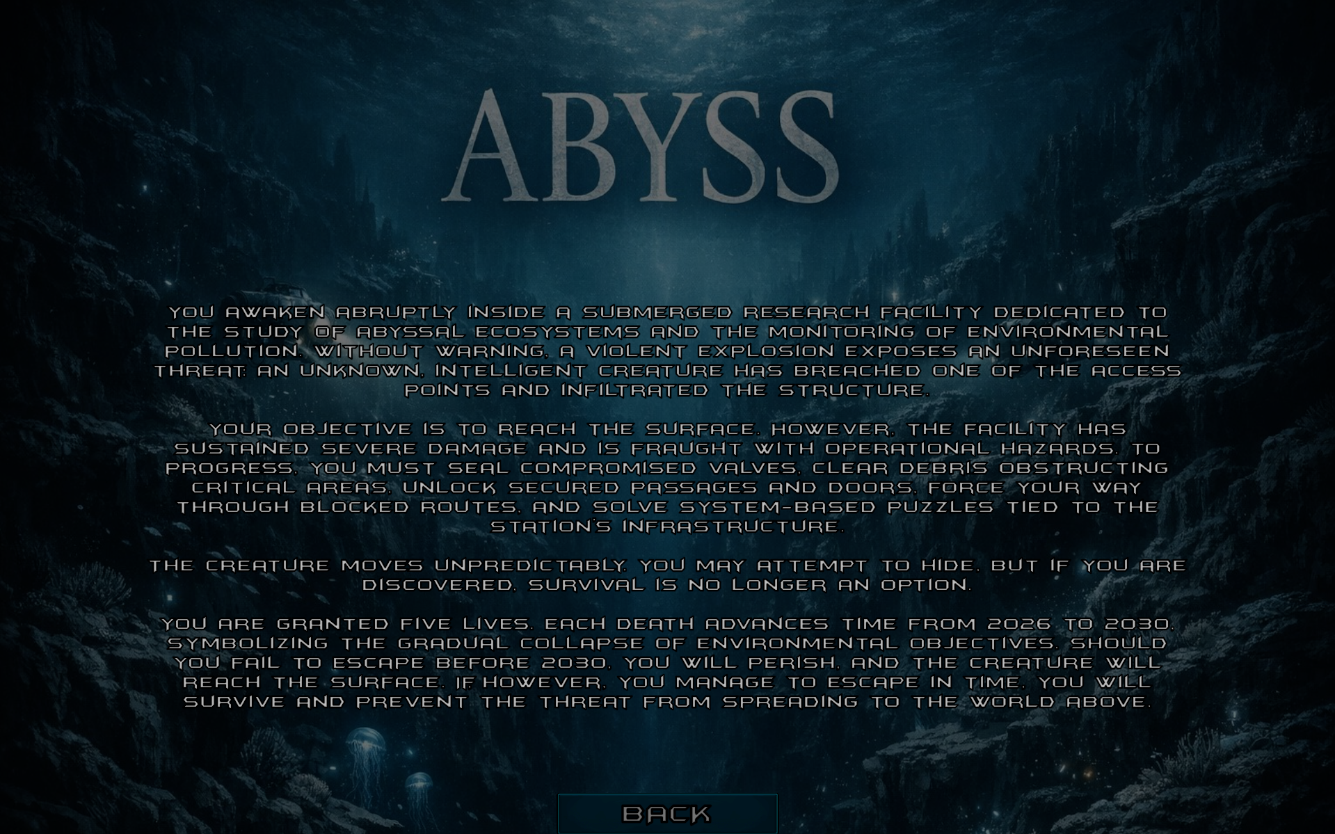 You have 5 lives, and each death advances the timeline from 2026 to 2030, symbolizing the stakes of protecting the environment. Reach the emergency escape route before your last life ends to survive—and prevent the horror from reaching the surface.